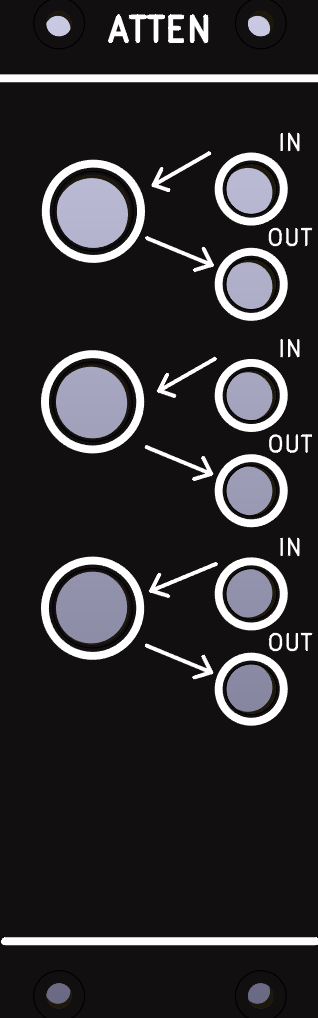 3 simple attenuverters, jumpers on the back can be used to change them into passive attenuators, no power supply is needed in that case.