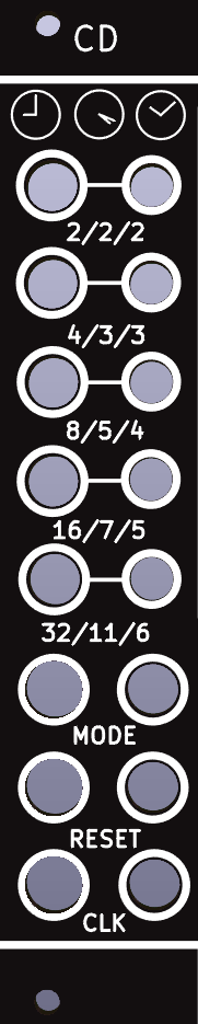 An Improved Clockdivider module based on the ATMEGA328P microcontroller instead of the CD4040 binary counter IC. Instead of simply counting in binary, this module can be switched to count in binary, prime numbers and harmonically. I am also thinking about making a fourth mode: Random mode, where at each trigger, the outputs have different probabilities to turning on or off. It's also possible to analyze the incoming clock frequency and output a multiple of the input frequencies to the outputs.