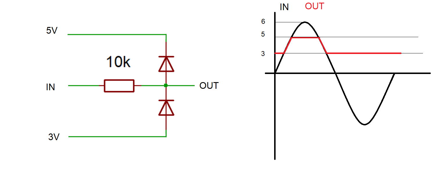 An example with the upper limit being 5V and the lower limit being 3V. The output of this circuit follows the input signal as long as it is within the upper and lower limits. The output never exceeds these limits (ignoring the diode drop).