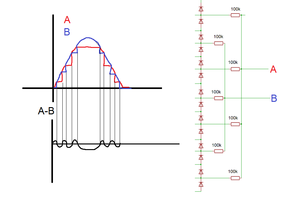 As in the Buchla circuit, every other band is summed together, resulting in two signals A and B (I did not draw the summing stages for simplicity) With no input, the bias voltages between the diodes sum up to zero volts, so with 0V in you get 0V out. OK. Boring.
