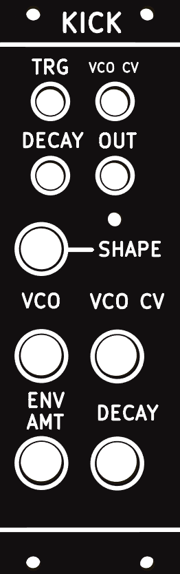 Simple Kick-Drum module with triangle core VCO with variable waveshape (morphs between triangle and square wave), VCA and Envelope Generator. The envelope has CV control over the decay.
