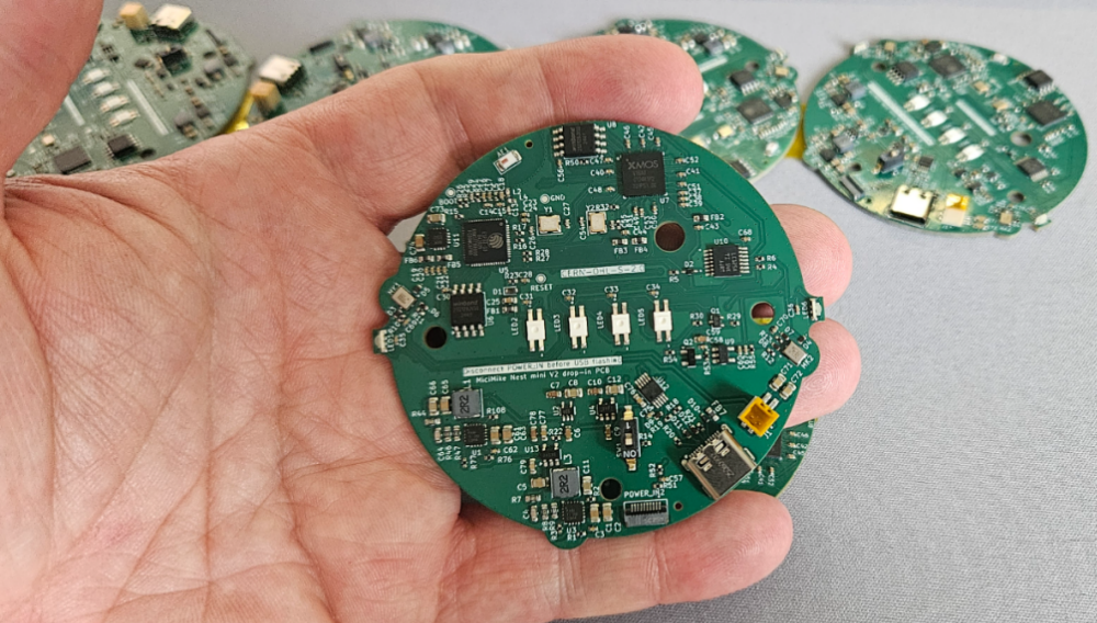 MiciMike Nest Mini is a drop-in PCB replacement for the "Google Nest Mini" (Google's second-generation smart speaker with a barrel connector charging port), but based on ESP32 and XMOS microcontrollers for running open-source firmware.