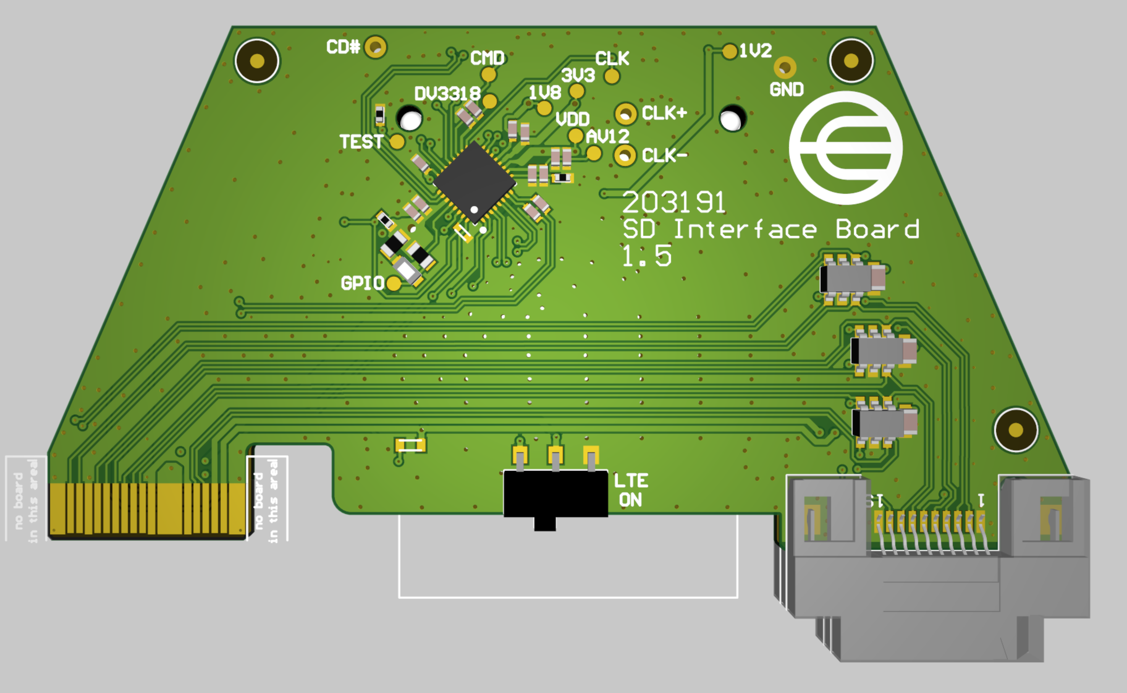 This relatively simple board's main funcionality is to provide an accessible SD Express card slot, external connectivity and power. It terminates inside the battery compartment and houses two main features: An adapter chip (RTS5264) for the SD Express to PCIe interface and a connector with Ethernet and USB lines. These are used for wired stationary deployments with a network cable and a fake battery power supply.